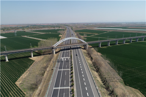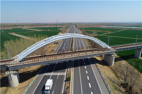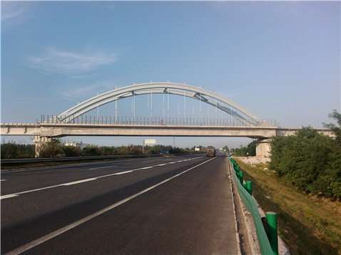 海青鐵路跨榮烏高速公路特大橋是海青鐵路全線特殊工跨(跨路施工)中,跨度最大,風(fēng)險(xiǎn)最高的一個(gè),主跨(DK9+723.950~DK9+789.65)上部采用鋼管混凝土系桿拱結(jié)構(gòu),計(jì)算跨徑64m,梁長(zhǎng)65.5m。