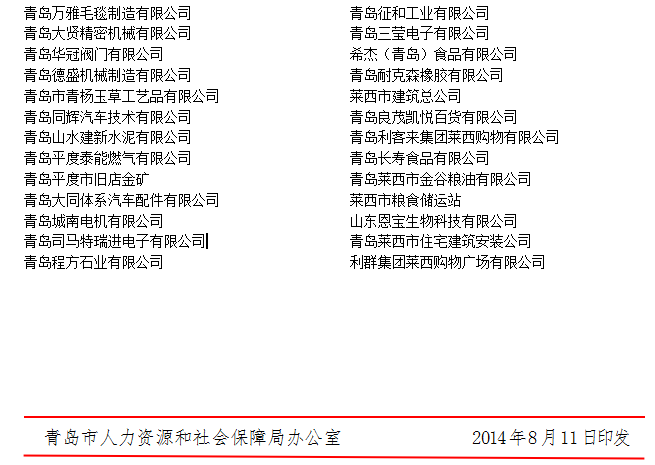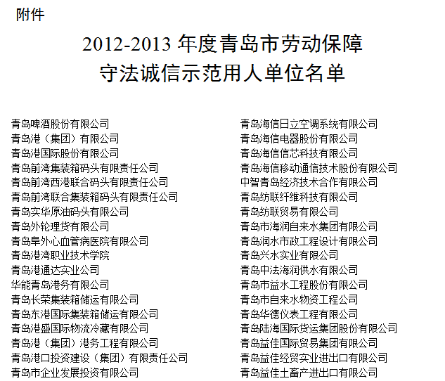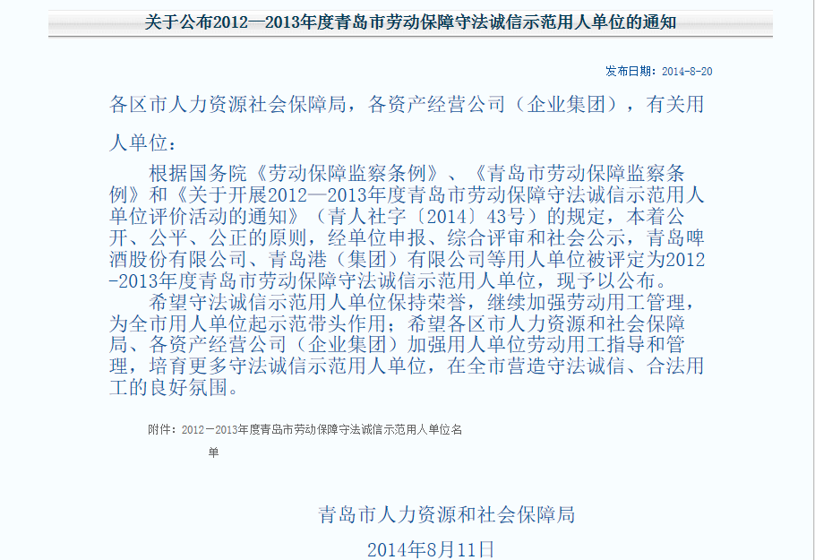 根據(jù)《勞動(dòng)保障監(jiān)察條例》、《青島市勞動(dòng)保障監(jiān)察條例》和《青島市勞動(dòng)保障守法誠(chéng)信示范用人單位評(píng)價(jià)辦法》等文件規(guī)定,我總公司和全資子公司青島匯泉?jiǎng)趧?wù)工程有限公司在青島市人力資源和社會(huì)保障局組織的2012-2013年度青島市勞動(dòng)保障守法誠(chéng)信示范用人單位評(píng)價(jià)活動(dòng)中順利獲選,這也是總公司自去年獲選后再次獲評(píng)該殊榮。