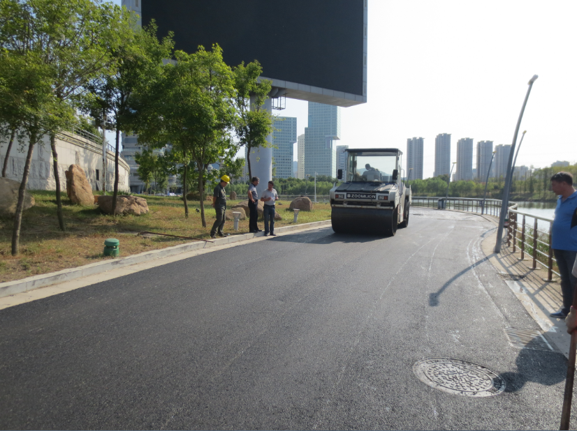 環(huán)湖路位于國信體育場游泳跳水館旁,道路全長625米,為體育場內(nèi)部主要道路之一。現(xiàn)狀道路面層為3cm厚彩色強(qiáng)固混凝土,起砂、破損嚴(yán)重,嚴(yán)重影響行車舒適性。本工程為舊路綜合整治工程,設(shè)計(jì)將車行道舊彩色透水混凝土面層進(jìn)行銑刨,并鋪設(shè)3cm厚AC-10瀝青混凝土