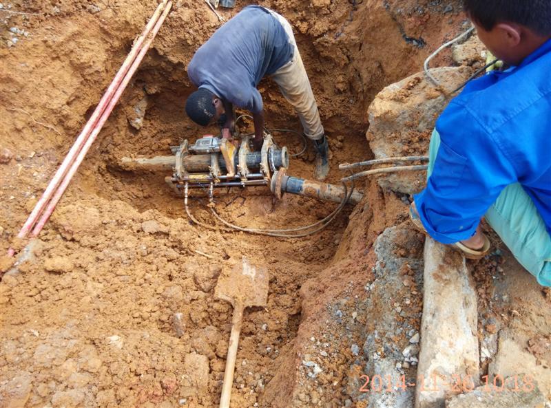 在接到此通知后,我公司迅速組織了項目籌備工作。姆比尼水廠項目部抽調(diào)施工管理人員于2014年11月1日進場,11月2日正式進行維修,共計維修破損管道9處,安裝取水點5處。其中維修破損管道2處為輸水管網(wǎng)和污水管道維修,共計鋪設DN250球墨鑄鐵管210米,De315雙壁波紋管 52米;其余7處為配水管網(wǎng)維修,共計鋪設De110PE管道265米, De63PE管道91米, De25PE管道131米。為保證工程順利完工,在公司領導的正確指導和大力支持下,項目部管理人員科學組織、合理部署、加班加點,克服了管道破損處分散,管道位于地面下排查難等困難,圓滿、高效地完成了此次管道維修任務。