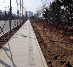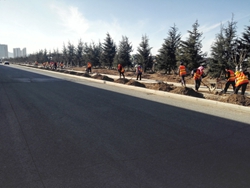 該工程于2015年8月份正式開(kāi)工,11月底施工范圍垃圾外運(yùn)全部完成,春節(jié)前管道工程施工完成,并進(jìn)行種植土回填。春季是苗木栽植的黃金時(shí)節(jié),為提高綠化苗木成活率,項(xiàng)目部提出“抓早字、促進(jìn)度”的施工方針,正月初五人員全部到位,正月初七復(fù)工。深翻地、挖樹(shù)穴,調(diào)苗木,同江路項(xiàng)目部人員積極協(xié)調(diào)組織,克服冬期施工、交叉作業(yè)等重重困難,全力推進(jìn)施工進(jìn)度。截止目前,喬木種植已基本完成,灌木種植完成70%,地被也在緊張有序的展開(kāi)施工,景觀效果已初步體現(xiàn)。