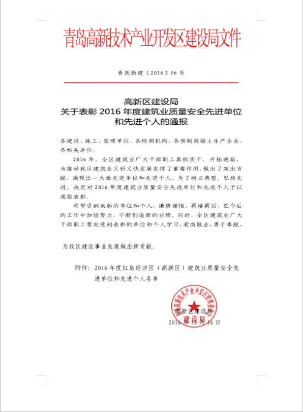 2016年12月底,高新區(qū)建設(shè)局召開(kāi)了“2016年度建筑業(yè)質(zhì)量安全先進(jìn)單位和先進(jìn)個(gè)人表彰大會(huì)”,我公司憑借在高新區(qū)市政基礎(chǔ)設(shè)施建設(shè)工作中取得的優(yōu)異成績(jī),被評(píng)為“2016年度紅島經(jīng)濟(jì)區(qū)(高新區(qū))建筑業(yè)質(zhì)量安全先進(jìn)單位”,公司承建的規(guī)劃中48號(hào)線道路、綜合配套及綠化工程被評(píng)為市政基礎(chǔ)設(shè)施工程質(zhì)量較好工程,公司程顯光和劉凱被評(píng)為紅島經(jīng)濟(jì)區(qū)(高新區(qū))質(zhì)量管理先進(jìn)個(gè)人、鄒曉杰被評(píng)為紅島經(jīng)濟(jì)區(qū)(高新區(qū))安全管理先進(jìn)個(gè)人。