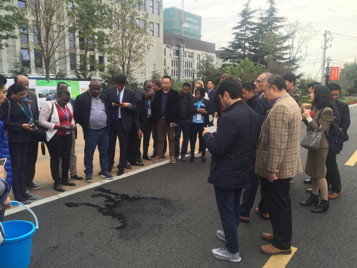 參觀國信體育場及李滄區(qū)委黨校海綿城市樣板工程現(xiàn)場圖片,圖為一分同事為官員們介紹工程并解答相關(guān)的技術(shù)問題。
