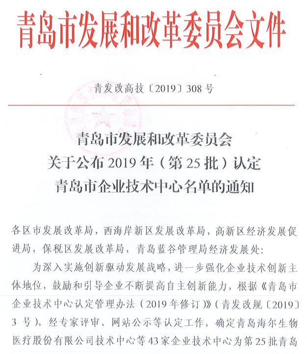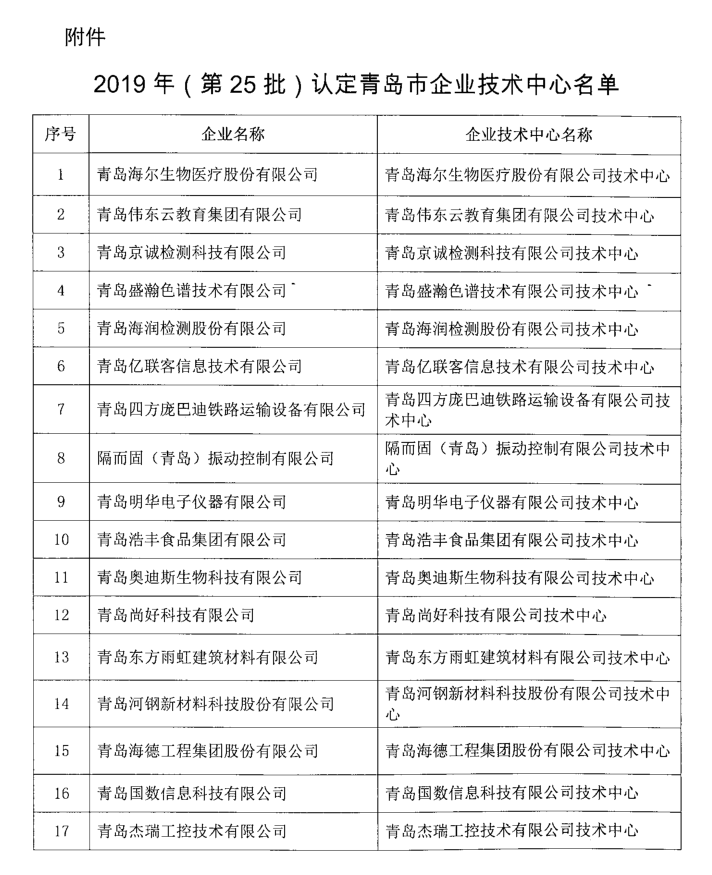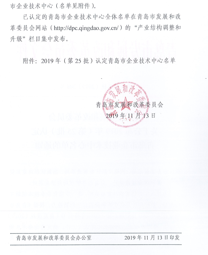 2019年11月13日,青島市發(fā)展和改革委員會(huì)正式發(fā)文《關(guān)于公布2019年(第25批)認(rèn)定青島市企業(yè)技術(shù)中心名單的通知》(青發(fā)改高技[2019]308號(hào)),我公司企業(yè)技術(shù)中心通過了青島市認(rèn)定。