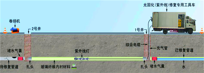 該技術(shù)原理為:使用水下內(nèi)窺機(jī)器人檢查管道破損情況;根據(jù)破損情況將滲透樹脂的玻璃纖維,從檢查井口通過專業(yè)技術(shù)人員、專用設(shè)備拉入所要修復(fù)的管道內(nèi)部;封閉兩端管口,在此玻璃纖維內(nèi)襯管內(nèi)充壓縮空氣;最終采用紫外線車自動化控制設(shè)備進(jìn)行照射使樹脂滲透進(jìn)破損管道縫隙完成修復(fù)。僅用4個小時,即可完成管道修復(fù)。