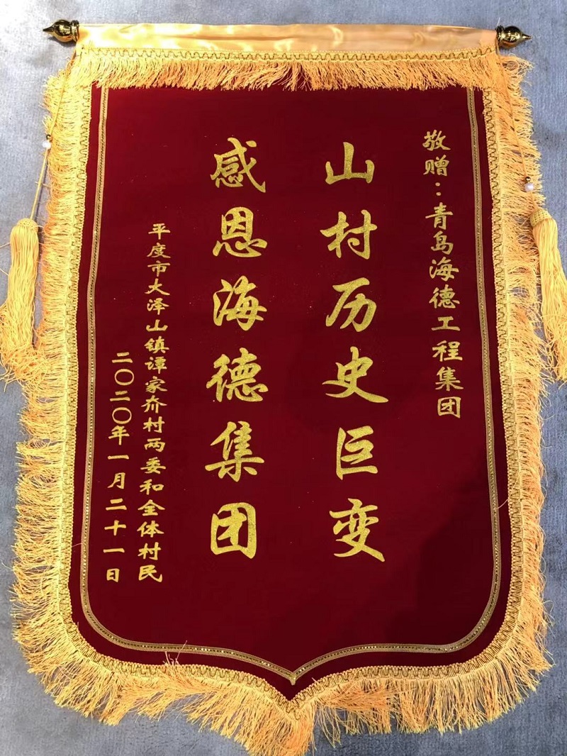 集團董事長鞏光磊對于孫夕臣書記一行的到來表示熱烈歡迎。孫書記表示此行的目的是為了代表平度市大澤山鎮(zhèn)譚家夼村兩委和全體村民對于海德集團為譚家夼村修筑兩條扶貧路表示衷心感謝。會上,孫夕臣書記向我集團贈送“山村歷史巨變,感恩海德集團”的錦旗,并祝愿海德集團蒸蒸日上,越來越好。