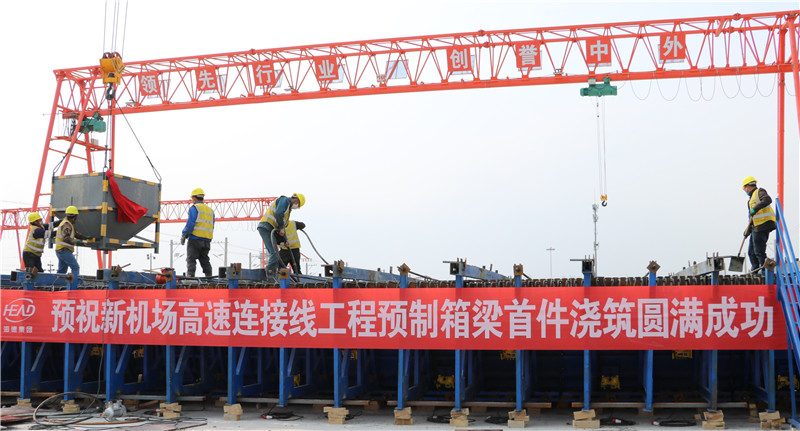 2020年4月8日上午11點18分,集團承建的新機場高速連接線(雙埠-夏莊段)工程主線橋一標段預制箱梁首件澆筑順利完成,標志著新機場高速連接線主線橋梁上部結構施工正式拉開序幕,也標志著全線1200余片裝配式砼箱梁正式開始預制,為年底主線通車目標奠定了堅實的基礎。