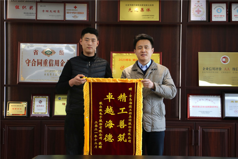 近日,由集團(tuán)承建的天水路、縱一路市政配套工程,在嶗山區(qū)城管局的調(diào)度下、集團(tuán)公司領(lǐng)導(dǎo)的帶領(lǐng)下及項(xiàng)目部的努力下,提前10天完成底層瀝青攤鋪工作,為微電子產(chǎn)業(yè)園的建設(shè)投產(chǎn)提供了配套保障。為此,歌爾微電子股份有限公司特向我集團(tuán)贈予錦旗以此表示感謝。
