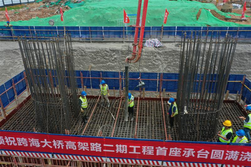 2022年7月28日上午10點(diǎn),由集團(tuán)承建的跨海大橋高架路二期工程一標(biāo)段首個承臺開始澆筑,混凝土順著泵車曲折綿長的泵送管道連續(xù)灌入密密匝匝的承臺鋼筋骨架之間,歷時3個小時,工程首個承臺順利澆筑完成,標(biāo)志著工程施工進(jìn)入全面提速階段。