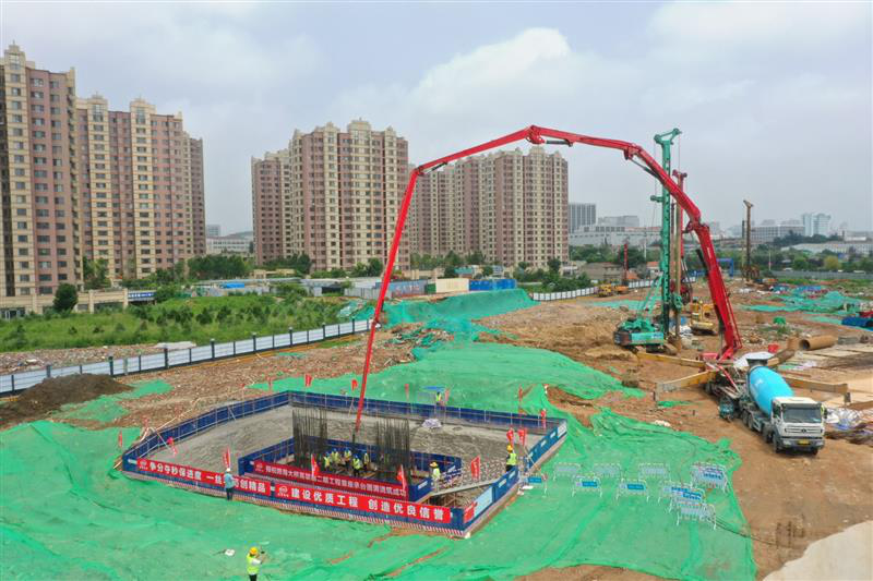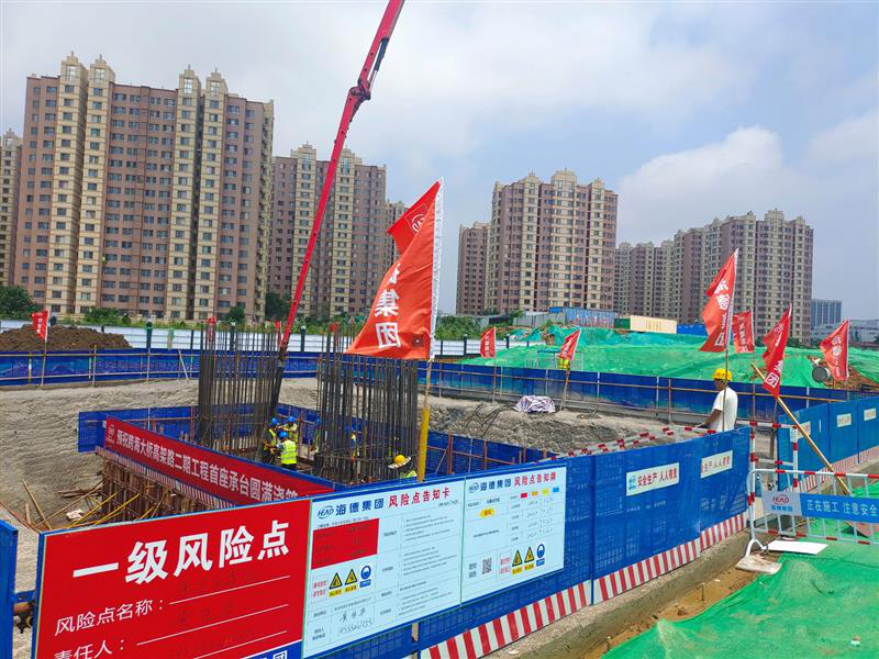 首座承臺澆筑為主線橋6#承臺,為確保承臺首件工程施工質(zhì)量,項(xiàng)目部嚴(yán)格遵循“質(zhì)量與安全并重、技術(shù)與施工并行”的原則,安全高效保質(zhì)保量地推進(jìn)承臺澆筑施工。工地上,延伸數(shù)百米遠(yuǎn)的作業(yè)面內(nèi),振動打樁機(jī)、旋挖鉆機(jī)、吊車等大型機(jī)械密集分布,同步流水作業(yè);建筑工人頭頂烈日,穿梭于機(jī)械轟鳴的施工現(xiàn)場,揮汗如雨。首個承臺澆筑過程中,根據(jù)領(lǐng)導(dǎo)班子帶班制度的規(guī)定,領(lǐng)導(dǎo)和技術(shù)人員全程旁站,為“首件工程”圓滿落地保駕護(hù)航。