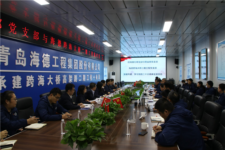 2022年12月5日下午,青島海德工程集團跨海大橋二期工程臨時黨支部與招商銀行青島分行營業(yè)部黨支部在海德集團跨海大橋高架路二期工程項目部會議室聯(lián)合開展“黨建共建”、“學(xué)習(xí)貫徹黨的二十大精神”主題黨日活動。黨的二十大代表、招商銀行青島嶗山支行大堂主管王瑾敏,嶗山區(qū)工信局機關(guān)黨委副書記董元波,招商銀行青島分行黨委委員、副行長侯登峰,營業(yè)部黨支部書記柳宏,海德集團黨總支書記、董事長鞏光磊,黨總支副書記、副總裁呂同占,大橋項目部臨時黨支部書記孫成山,黨支部全體黨員、預(yù)備黨員、入黨積極分子等共同參加了此次活動。海德集團黨總支副書記、副總裁呂同占主持活動。