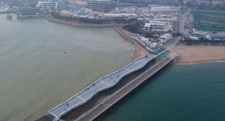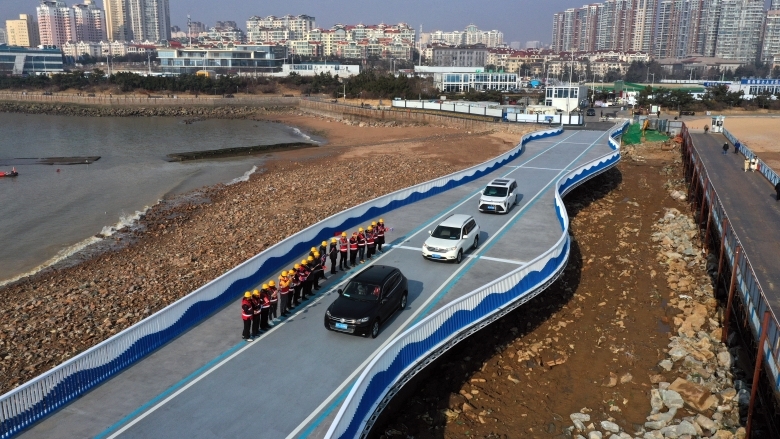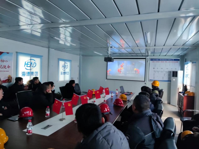 項目總工鄭林楠結合展板詳細介紹了項目安全文明施工標準化建設情況,鉆孔灌注樁基沖擊成孔與旋挖組合接力施工、鋼套箱及水下承臺、雙曲線花瓶墩、礫石混凝土鋪裝、異形曲線不銹鋼欄桿等工藝應用情況。重點介紹了涉海施工中便道、圍堰、鋼套箱的使用,樁基施工中沖擊鉆與旋挖鉆組合施工中遇到的問題及解決方法,安全標準化措施落實情況。最后在項目會議室觀看了由集團設計院制作提供的小麥島橋梁施工動畫,生動展示了建設的各流程、工藝、項目標準化建設情況。