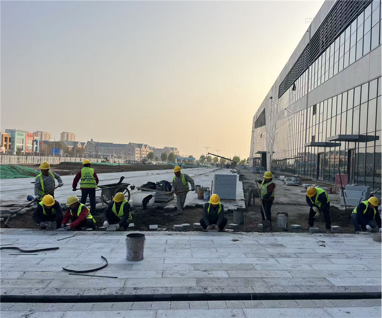 宿豫電商園區(qū)附屬配套工程施工內(nèi)容涵蓋道路、管網(wǎng)、鋪裝、塑膠場地、綠化、水景、小品、景觀照明等方面。自7月初進場,項目部全體人員齊心協(xié)力推進項目有序開展,并在勞務(wù)管理方面設(shè)置專員,確保工人工資發(fā)放到位。場地空間的局限、雨季的干擾以及交叉施工的復(fù)雜性,都未能阻擋工程的進度。經(jīng)過不懈努力,10月底項目所有地下管網(wǎng)施工全部完工,11月場地整平、廣場鋪裝等工作大面積展開。