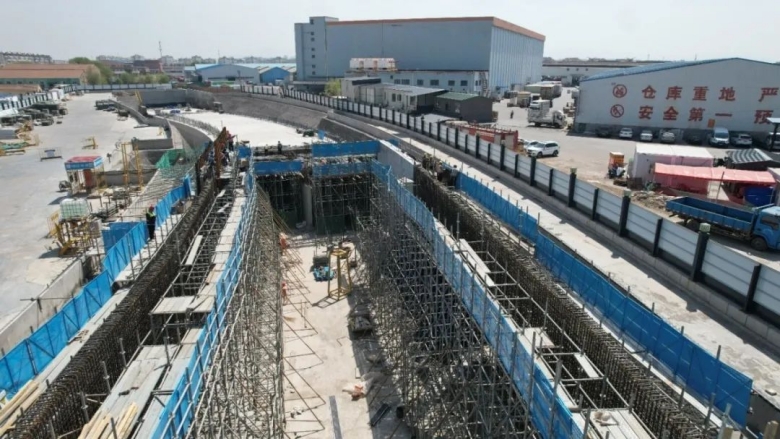 棘洪灘車輛段出入線從天山二路站引出,沿新城二路向西敷設,下穿路北多棟建筑后上跨正線區(qū)間,下穿青銀高速路基段及山東物博公司廠房后接入棘洪灘車輛段。區(qū)間最低點設置下臥泵房,是全線貫通的重要一環(huán)。