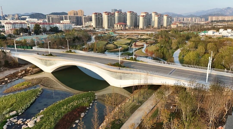 科技園五路橋,名為《漣漪》,橋梁靈感來源于水滴落下的那一瞬間形成的美妙漣漪,橋身勾勒出水滴漣漪蕩漾的紋路,從遠處眺望猶如一片碧波傾灑在水面之上,層層漣漪、海納百川??萍紙@五路橋采用三跨連續(xù)拱型結(jié)構(gòu),跨徑為32.5+50+32.5m。其中主跨跨徑50米,是青島市跨徑最大的現(xiàn)澆混凝土箱型拱橋。拱圈側(cè)面設(shè)計為異形混凝土造型,上部銜接異形漣漪裝飾,中跨墩柱上方設(shè)置4個觀景平臺,是典型具有藝術(shù)感的景觀拱橋。此次施工圍繞橋梁外觀美化與生態(tài)氛圍融合展開,通過定制化的裝飾設(shè)計,將橋梁線條與張村河生態(tài)公園的自然景觀相呼應——橋身采用與周邊綠植、水系相協(xié)調(diào)的色彩搭配,欄桿處增設(shè)簡約大氣的生態(tài)主題裝飾元素,同時優(yōu)化了橋梁夜間照明系統(tǒng),讓橋梁在白天與自然景致渾然一體,夜晚則以柔和燈光勾勒輪廓,成為公園內(nèi)的一處亮眼節(jié)點。