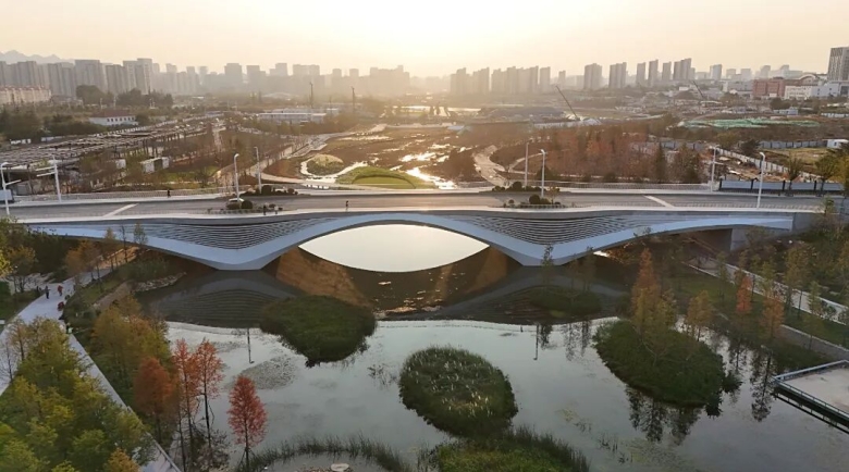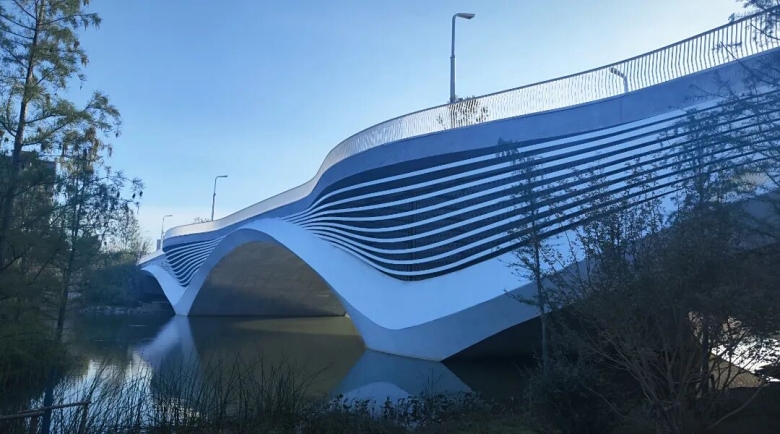 施工完成后,造型獨特的雙曲面混凝土及漣漪裝飾構(gòu)件線條流暢、層次分明,展現(xiàn)出一種自由而和諧的美感。不僅徹底改善了原有橋梁的視覺效果,更串聯(lián)起公園內(nèi)的景觀動線,讓市民在漫步、休憩時能更直觀地感受張村河的生態(tài)之美,顯著提升了公園游覽體驗,為周邊居民及游客打造了更具觀賞性、舒適性的戶外空間。