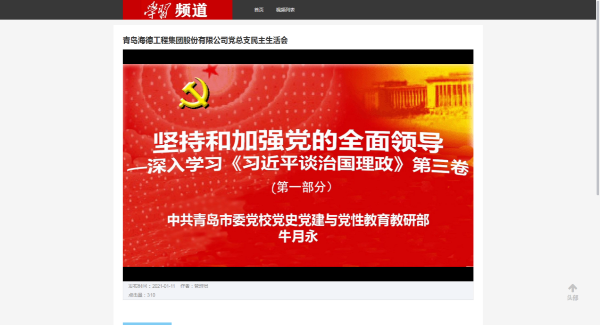 2021年1月12日,集團公司組織全體黨員開展學習《習近平談治國理政》(第三卷)和民主生活會活動,通過“學習強國”的“學習頻道”網(wǎng)絡(luò)直播形式,收聽了中共青島市委黨校牛月永教授的《堅持和加強黨的全面領(lǐng)導》網(wǎng)絡(luò)黨課。